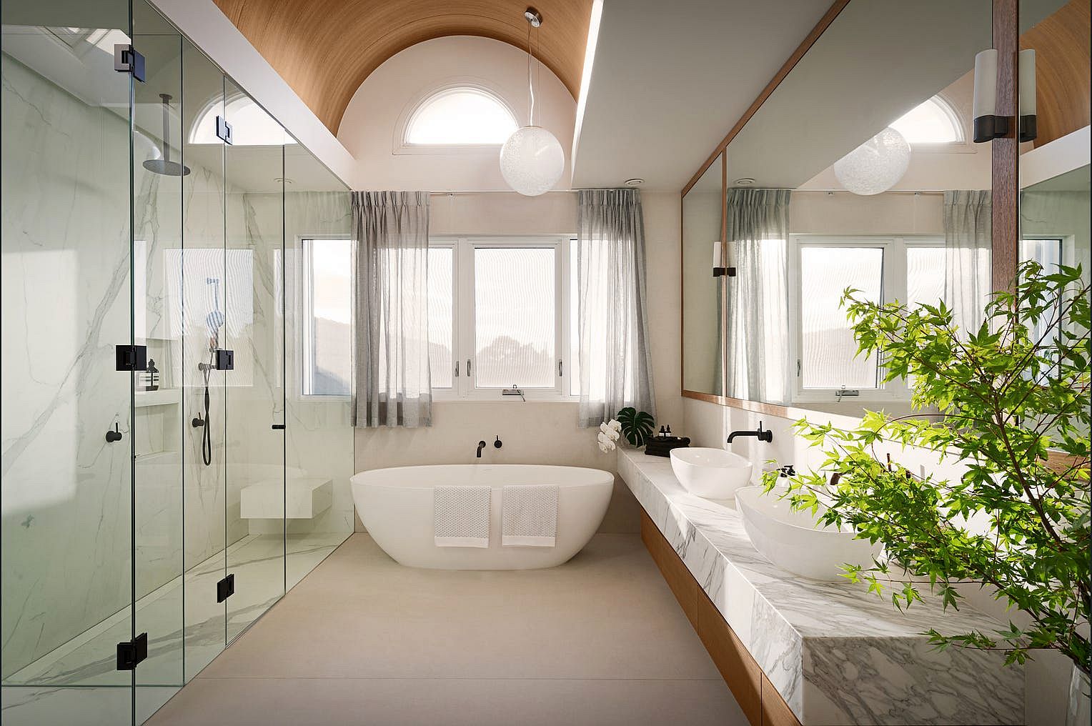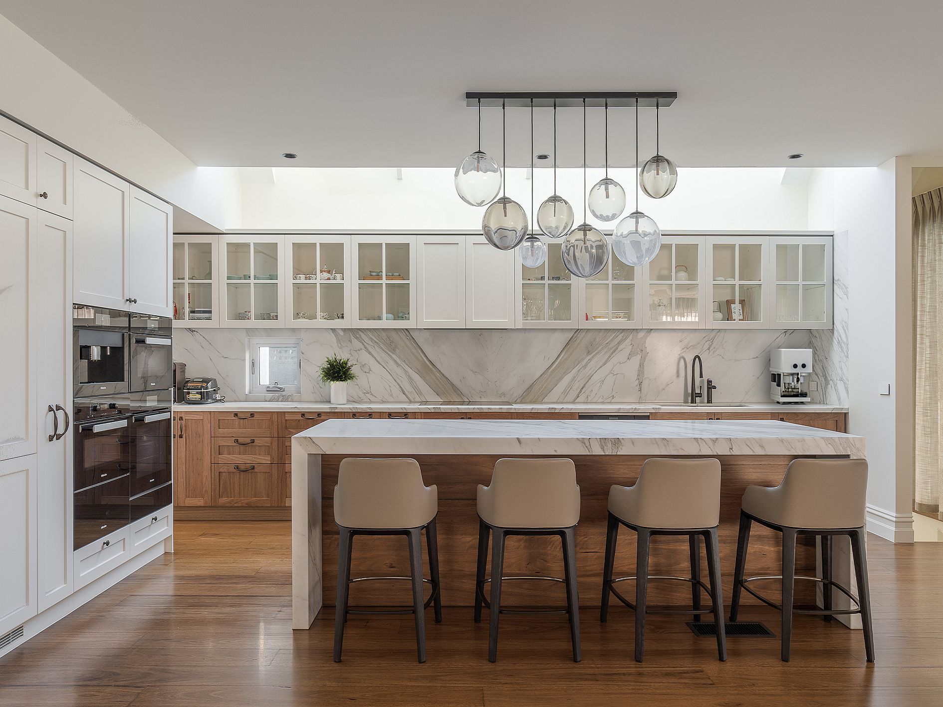 The use of Blackbutt timber on the floor and the joinery brings warmth and quality to the house. It also creates an elegant contrast with the extensive use of book-matched Calacatta marble. The joinery and buffet furniture throughout the house were custom designed and custom built. It allowed Hatz and the client to have a full control over the look and feel of the different elements, thereby creating a holistic vision of Home.